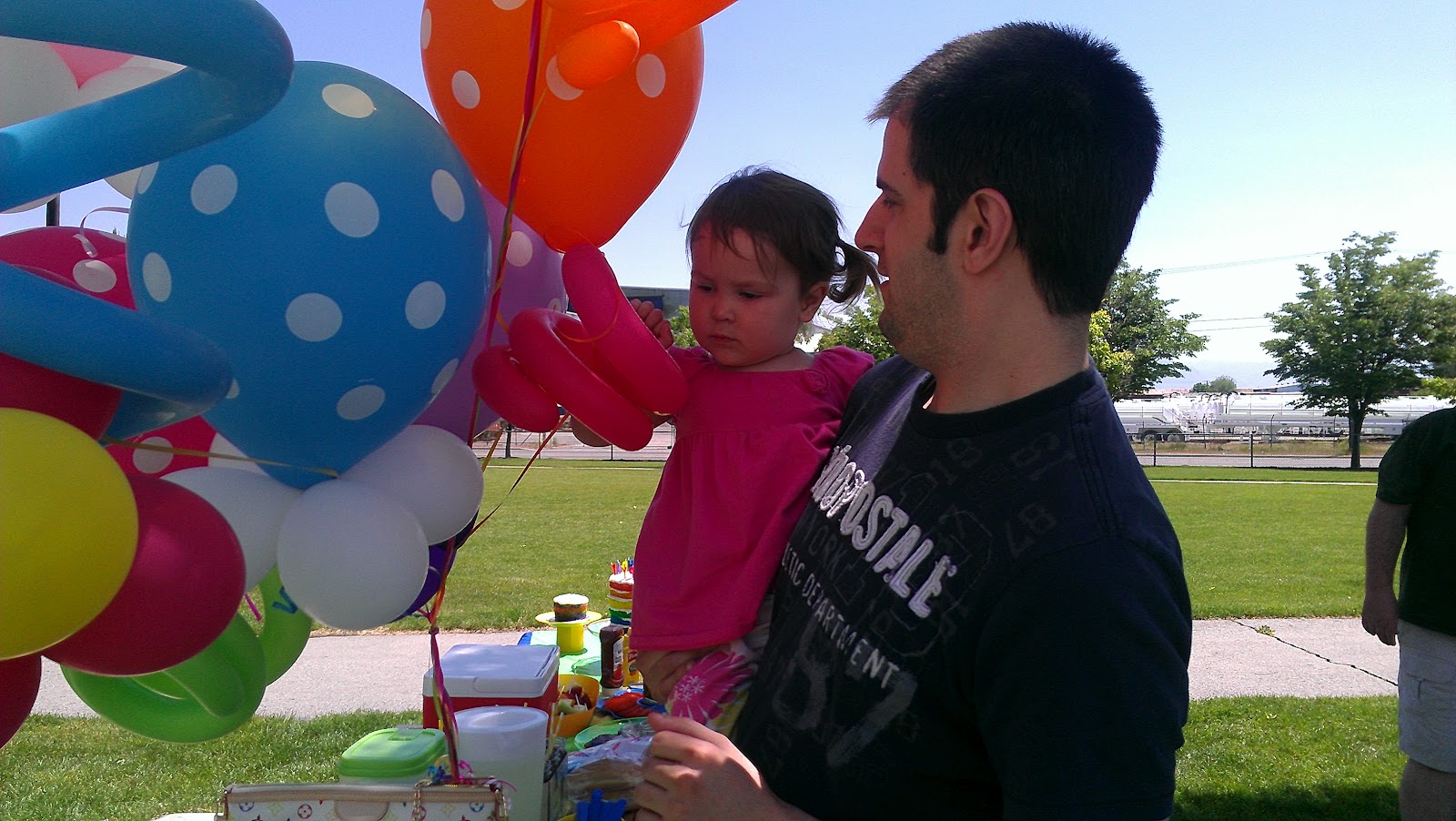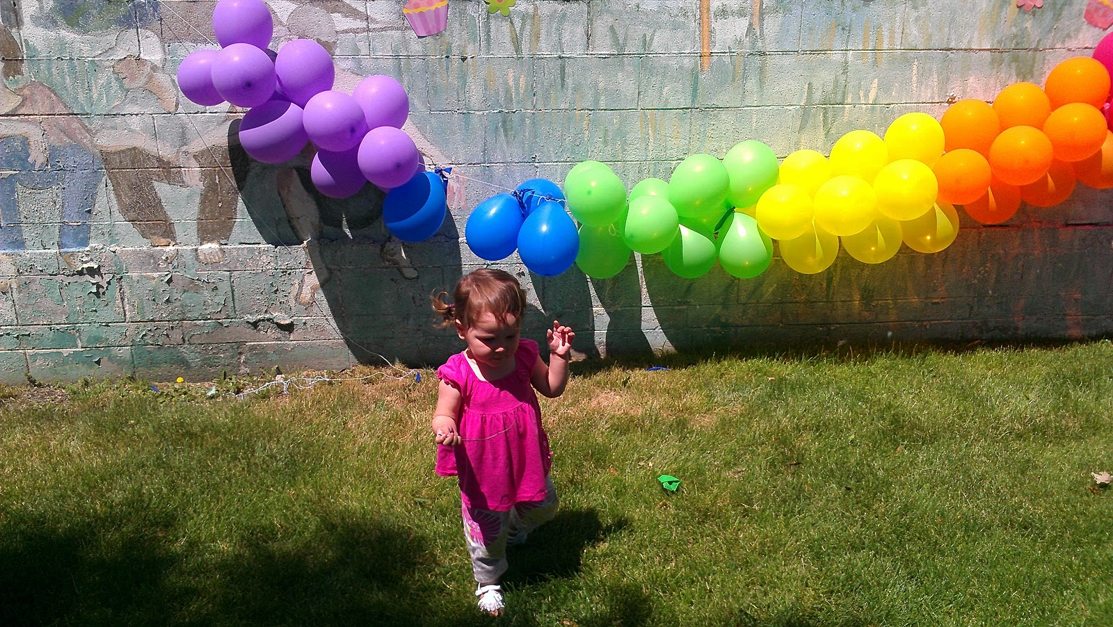 After the March for Babies we went to a park for Kendal and Lyla’s first birthday! Ally and her mom made an awesome rainbow balloon banner and Aurelia LOVED it. Lucky for her, nobody minded that she tried to pop them all. Here she is, stick in hand, walking away from the scene of the crime ๐