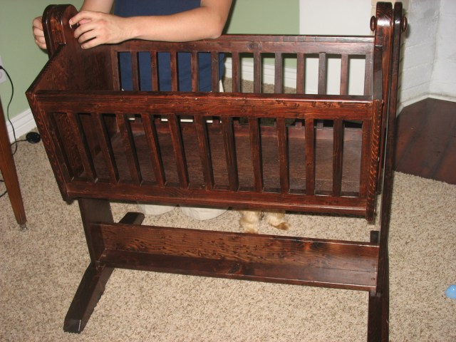 | The beautiful cradle Daniel’s step-dad Kirk made for us. We have a cradle mattress and cute little sheets for it too. |