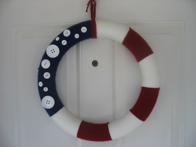 I like to always have a wreath on our door. I think they’re a friendly way to be welcomed home and to welcome others who come over. So, on Pinterest I found this cute idea for a 4th of July wreath. It was super easy to make (its just yarn around a foam wreath, hot glued buttons) but it was really time consuming. I’m going to make a watermelon version but after that I’m done with yarn wrapped wreaths 🙂