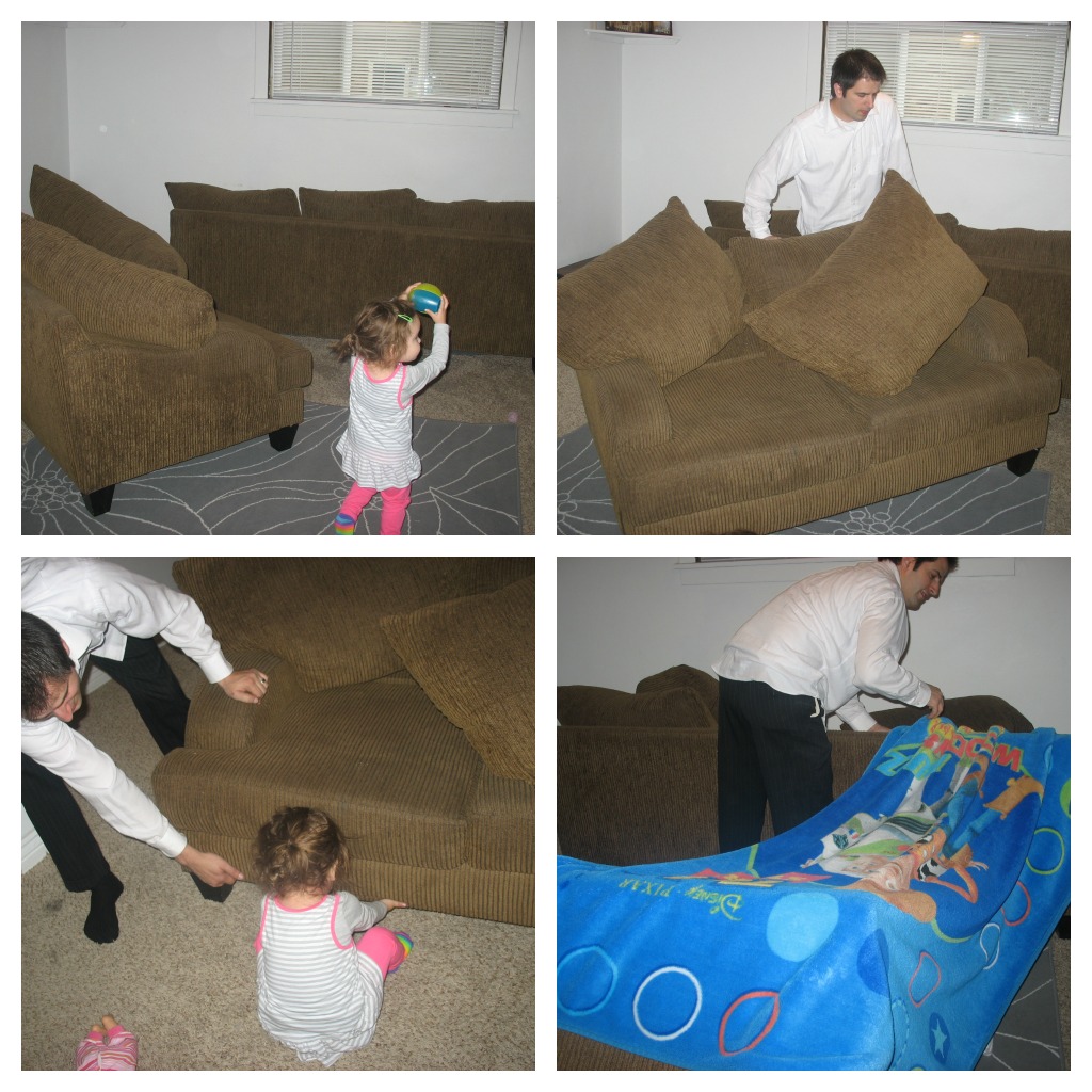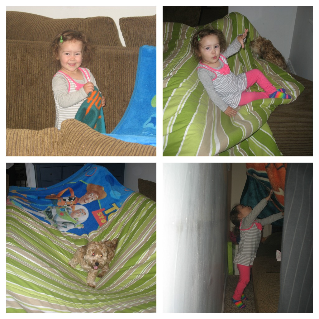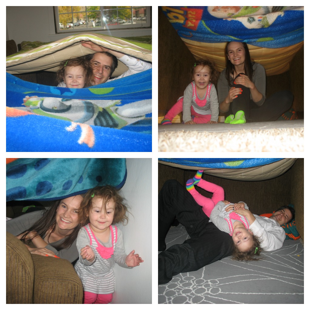 We love making blanket forts, but I don’t think we’ve made a huge one since before Aurelia was born 🙂 Today we made a gigantic blanket fort in our family room. Aurelia was SO excited when she realized that not only were we making a “tent” but it was going to be humongous 🙂