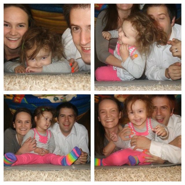 | Using the timer on the camera turned into a hilarious experience. We were all laughing so hard 🙂 Aurelia was squirming, freaking out about the flashing lights on the camera, wanting to get closer to the screen and push the buttons 🙂 |