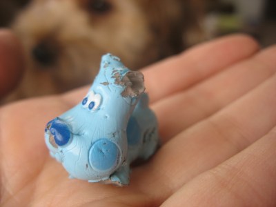 The next day I heard Aurelia yell “Oh no BLUUUUE!!! Oh nooooo Bluuuuue!!!” and found her holding what was left of her little Blue figurine. Toby had gotten to her and her big ears and three of her legs were gone.