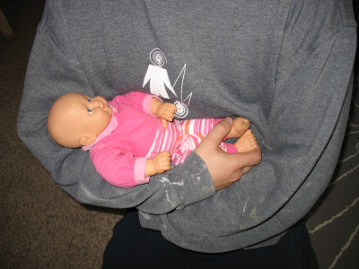 A few days ago Aurelia had Daniel hold her baby doll and showed him how to do it properly 🙂 Too cute.