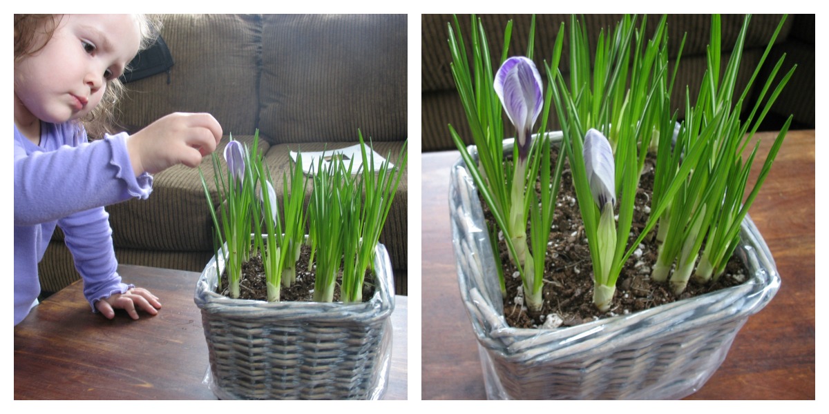 For Christmas one of my grandparents sent Aurelia a basket with bulbs to watch grow. It was awesome! When we got the basket there were just a few little white tips sticking out of the dirt. About a week later they started poking up little green bits and next came the pretty flowers. The instructions said they would open one after the other and they did. Everyday there was a new flower until the whole basket was full of cute little purple flowers. Aurelia LOVED it. She liked checking on her purple flowers everyday and giving them water. They’ve been a big hit 🙂 WAY awesome idea.