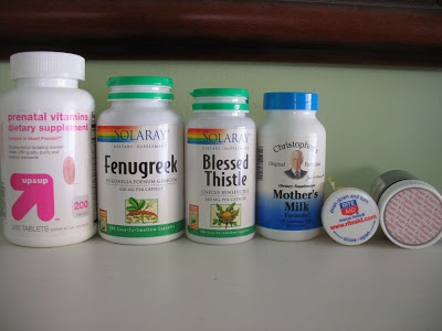 | All my induction stuff. A prenatal, Fenugreek, Blessed Thistle, Mother’s Milk, Progesterone and Domperidone. Also Mother’s Milk tea isn’t in the picture. I took Fenugreek to help my supply while nursing Aurelia. |