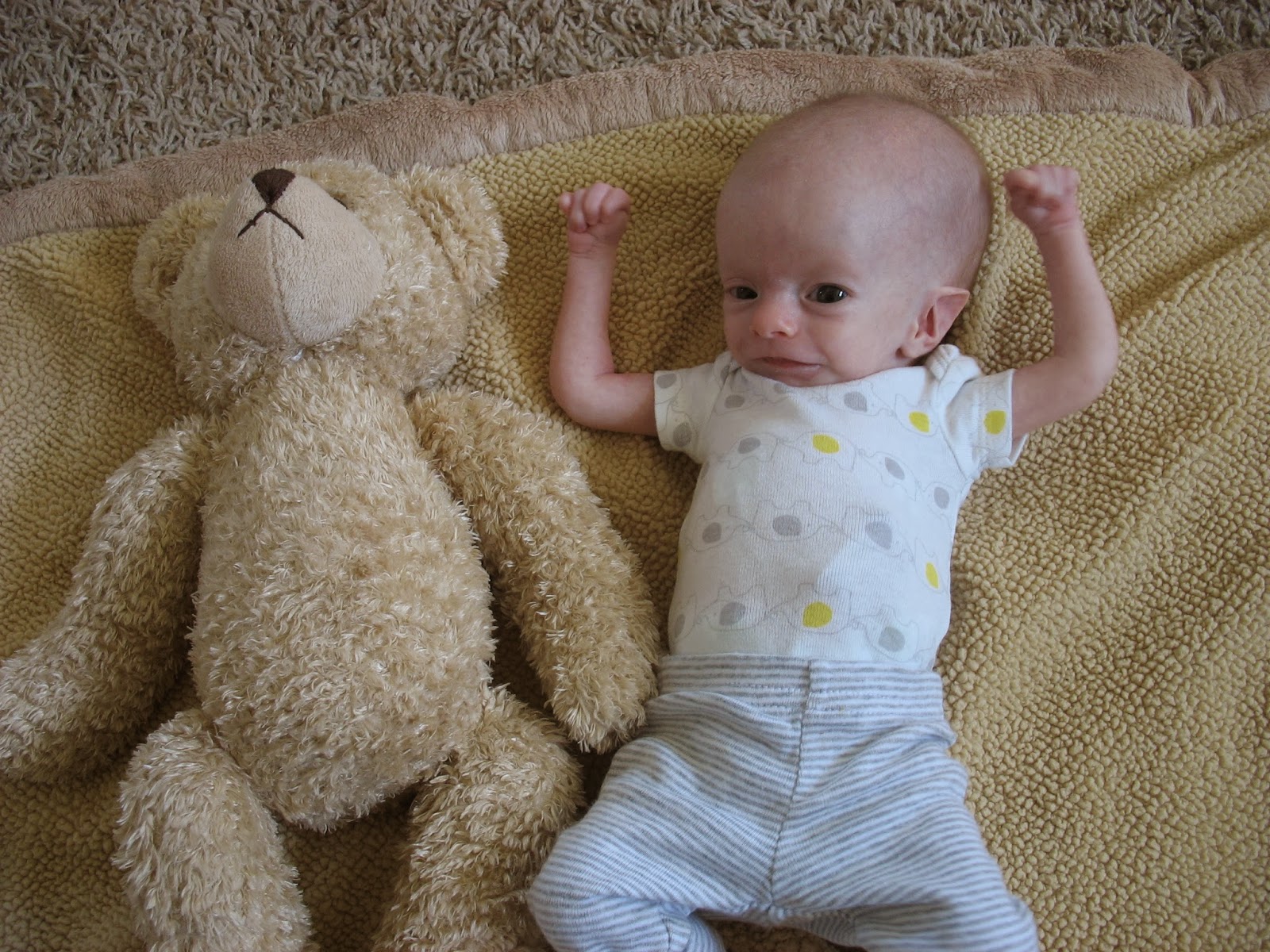 Last week Noah’s physical therapist started coming to our home to work with him. He said Noah is doing really well 🙂 He said as far as what he’s doing physically he’s on par with a 2-3 month old. Socially/intellectually though he’s at about a 5-6 month level! 🙂 That was pretty fantastic to hear. 🙂 One of the many, many miraculous things about Noah is that even though he had severe IUGR, his was “head sparing” meaning his head grew at an almost normal rate (which is why he has a huge head and teeny body). Every little bit of nutrients and growth he was getting seemingly went to his brain, heart and lungs. That’s how he was blessed to be as healthy as he was in spite of that diagnosis. So, he’s got plenty of room for his brilliant little noggin to grow and he appears to be taking advantage of that 🙂
