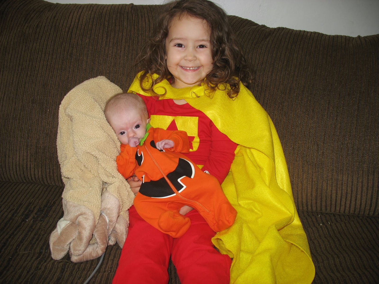 For Halloween Aurelia was Word Girl (a PBS super hero) and Noah wore a cute little preemie pumpkin outfit from his birth grandma ๐ For Aurelia’s costume I made a no-sew cape from yellow felt (usingย this tutorial) and hand-sewed the Word Girl star onto the chest of a red hoodie.