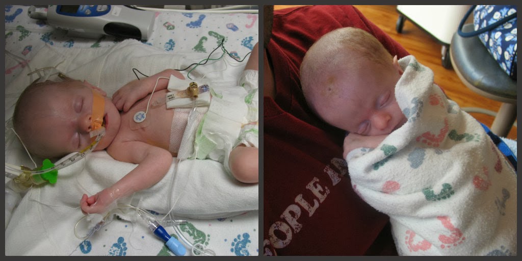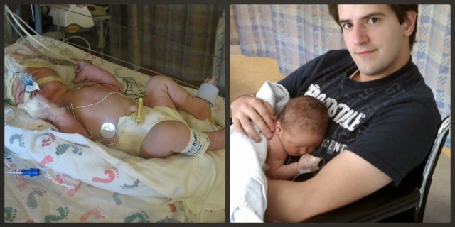 | Noah in the NICU after surgery at about 7 weeks old, being snuggled by Daniel in the same NICU. |