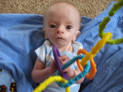 He likes to look at everything but fewer things motivate him to reach out. His hands are doing so well! He has them relaxed almost all the time now 🙂 It’s so good to see him be able to grab onto things he wants to explore 🙂 He’s still having some difficulties with opening his thumbs but he is doing SO well with the rest of his fingers 🙂 He still doesn’t have a ton of arm strength to hold things but he loves playing with the rings in his baby gym and we hang toys from them so he can play with and hold them but doesn’t have to support the full weight 🙂