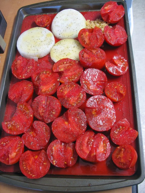I put the tomato halves, onion slices and minced garlic on a baking sheet, drizzled (…bleh, I don’t like that word) with olive oil, threw on a bit of salt and pepper and put it in the oven at 450*.